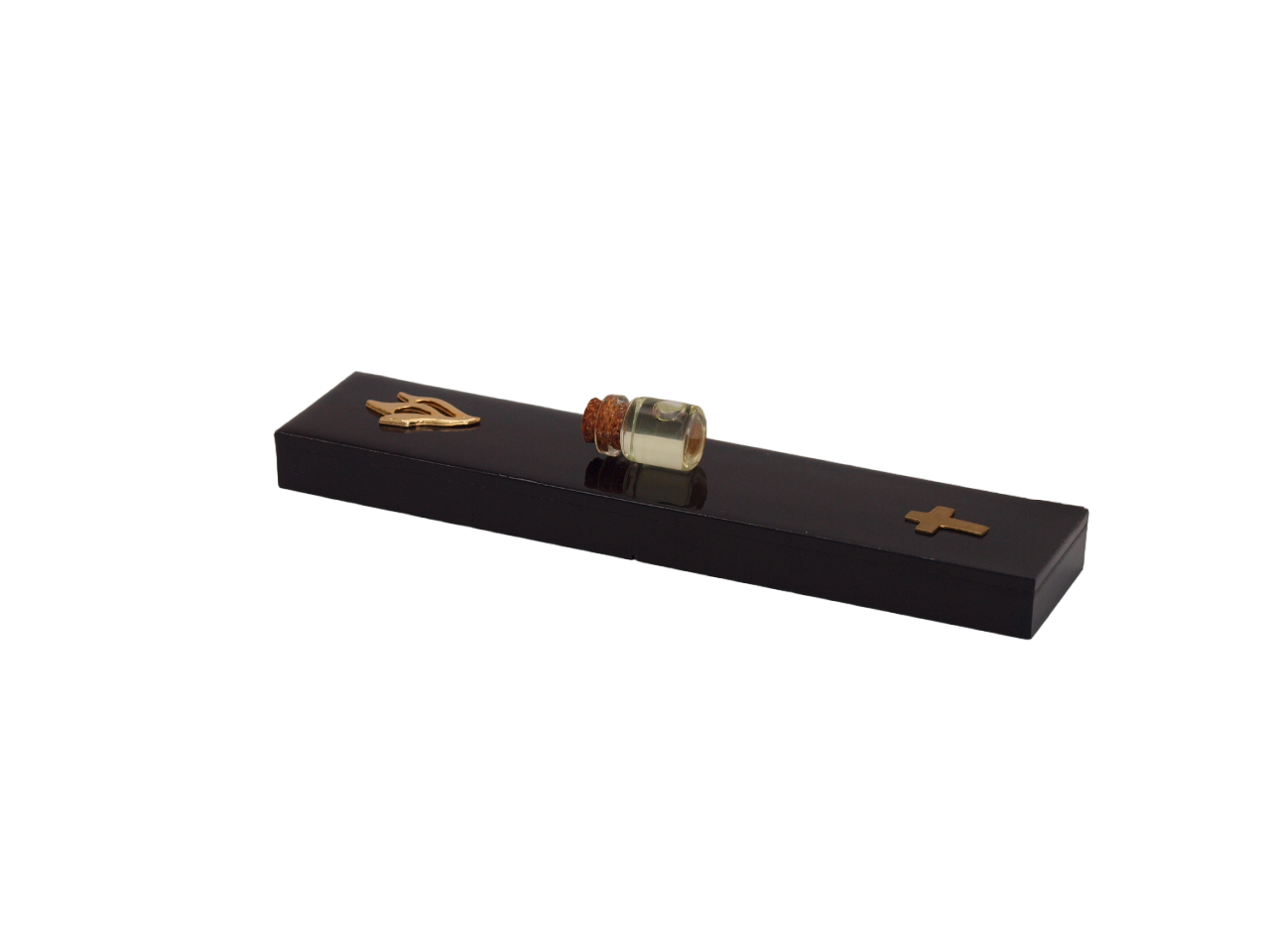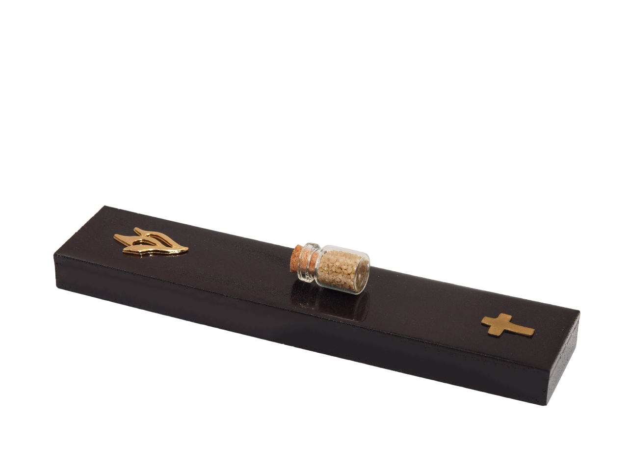 Featuring a prominent gold shin letter, our mezuzah case is designed to hold sacred artifacts such as blessed soil, holy water, or anointing oil. We source these artifacts from trusted Etsy sellers in Israel and can provide credentials upon request.
